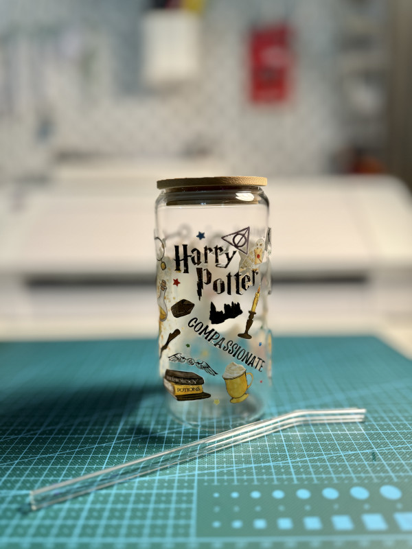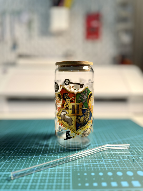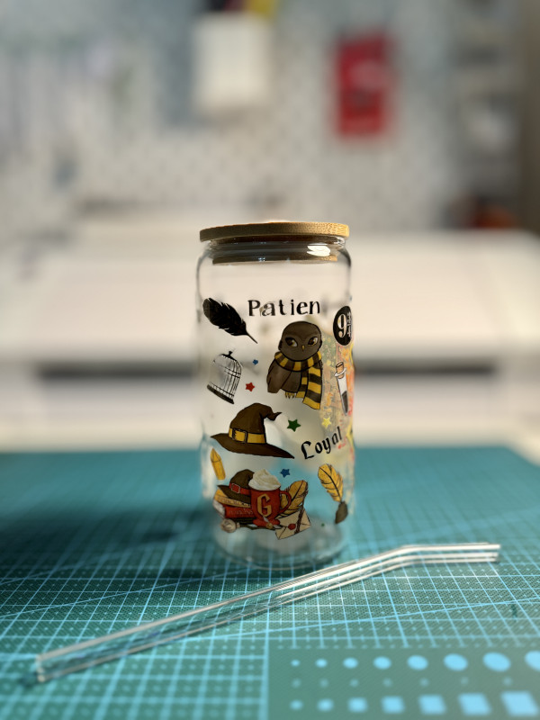 كوب زجاجي مميز مع غطاء مصنوع من خشب البامبو بالإضافة لمصاص مصنوع من الزجاج.